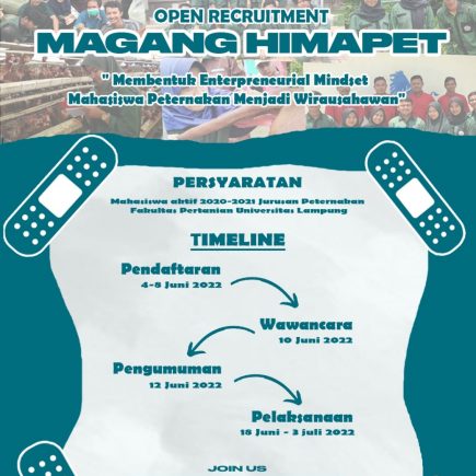 Himpunan Mahasiswa Peternakan (HIMAPET) mengadakan kegiatan magang khusus bagi angkatan 2020 dan 2021 dengan tema “Membentuk Enterpreneurial Mindset Mahasiswa Peternakan Menjadi Wirausawan”. Kegiatan tersebut telah bekerja sama dengan beberapa perusahaan peternakan ruminansia dan unggas di Lampung. Pada hari Kamis 16 Juni 2022 diadakan pembekalan di Ruang 101 Jurusan Peternakan. Sebagai Pembina Himapet, Ibu Etha ‘Azizah …