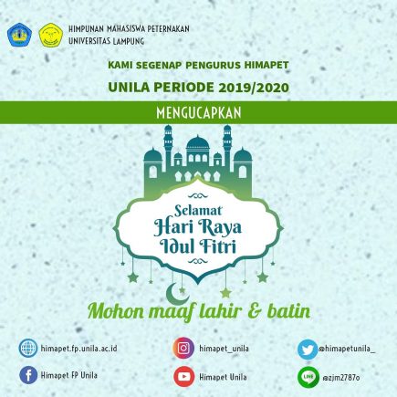 ✨[ Selamat Hari Raya Idul Fitri 1441 H ]🌜 ______ Sambut hari kemenangan dengan jiwa ikhlas yang saling memaafkan. Bersihkan hati di hari yang fitri, mari kita kembali menjadi insan yang suci. Karena sesungguhnya saling memaafkan akan memperingan langkah kita di hidup ini. Selamat meraih kemenangan atas takwamu 🤗🌜 Keluarga Besar Peternakan Unila Mengucapkan Taqabbalallahu …